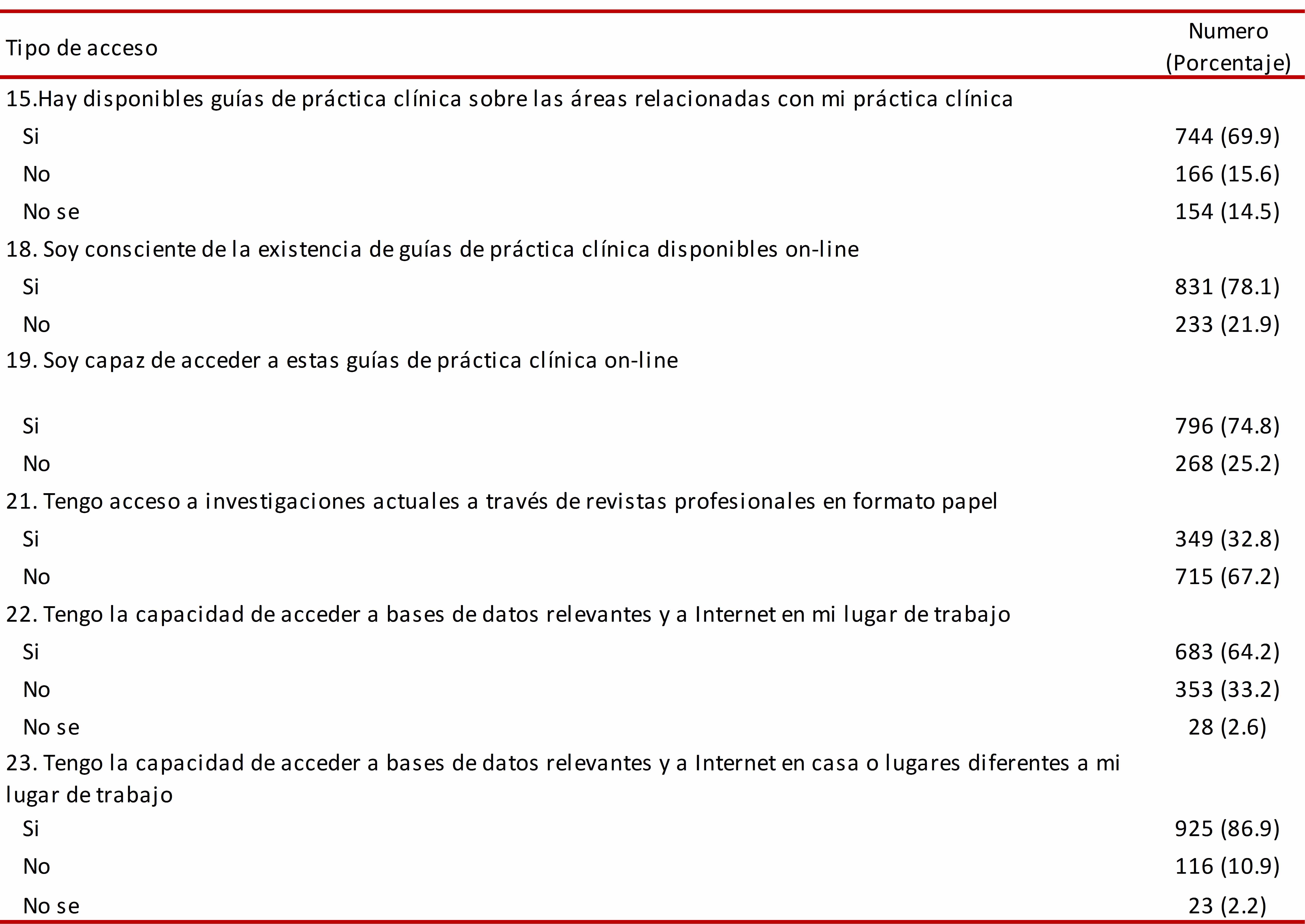 Se encontró que el conocimiento de la disponibilidad fue de manejo para el 69.9% y desconocido para el 14.5%. El conocimiento de la existencia y disponibilidad de las guías "en linea" fue reportado por el 78.1% de los encuestados, mientras que el 21.9% manifestó no conocer esta información. El uso de bases de datos relevantes e internet en casa o lugares diferentes al lugar de trabajo es una herramienta de uso disponible para el 86.9% (Tabla 5).