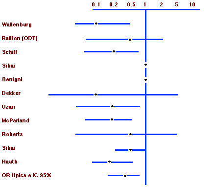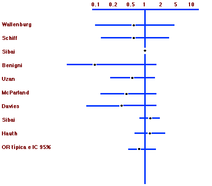 preeclampsia (OR típico = 0.52 con IC 95% = 0.40-0.68) pero no