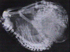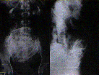 En la ecografía pélvica se encontraron imágenes de tumoración sólida irregular, con calcificaciones en su interior independientes del útero, endometrio engrosado de 21 mm con imágenes ecomixtas irregulares (Figura 1). En el legrado-biopsia de endometrio se descubrió una hiperplasia compleja sin atipias. Se inició el estudio complementario para tumor de ovario: rectosigmoidoscopia normal, cistoscopia normal. Durante la urografía excretora, en la placa simple se observó una imagen de 17 x 14 cm que correspondía a calcificaciones de estructuras óseas y membranas fetales, sugestiva de feto calcificado (Figuras 2,3). Se programó para cirugía con diagnóstico de litopedion.