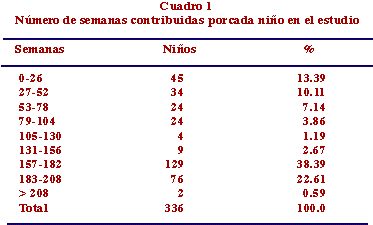 Se incluyeron un total de 340 niños en el período octubre de 1986 a julio de 1987. El Cuadro 1 presenta el tiempo de observación de los niños hasta terminar el estudio o salir de él por voluntad propia. (Vale la pena anotar que algunos niños se observaron por más de los 36 meses previstos inicialmente). El total de semanas de observación (tiempo transcurrido entre la fecha de nacimiento y la salida del estudio) fue 43,379. Algunos niños no se vigilaron todas las semanas debido a diversas imposibilidades que impidieron tener acceso a la familia; por tanto, el total efectivo de semanas de estudio fue 40,379. La información que aquí se presenta cubre estrictamente la información obtenida durante el período efectivo. En consecuencia, cada niño contribuye con un tiempo distinto al total de semanas de observación.
