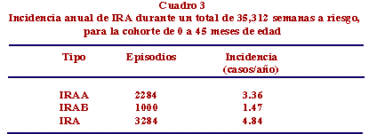 El Cuadro 3 muestra las tasas de incidencia. Se calcularon 35,312 semanas a riesgo, de un total de 40,379 semanas observadas (se excluye el tiempo en que el niño tenía un episodio de IRA). Un total de 3,228 episodios cumplieron los criterios para ser catalogados como IRA, lo que da una incidencia de 4.84 casos de IRA por niño por año, de los cuales 3.36 eran de IRAA y 1.47 de IRAB.