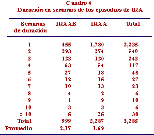 Como se puede apreciar en el Cuadro 4, la duración en semanas de la IRAB fue en promedio 2.17 semanas, vs. 1.69 para la IRAA (p < 0.001); 91% ó más de todos los episodios tuvieron una duración de 3 semanas o menos de duración.