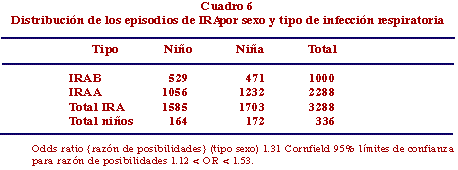 La distribución de las IRA entre IRAA e IRAB mostró que los niños estaban significativamente más afectados por la IRAB con una relación niño/niña de 1.12 mientras que la relación niño/niña de los afectados con IRAA fue 0.86 (Cuadro 6).