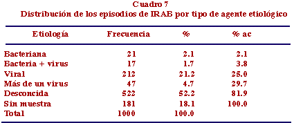 Se estudió la distribución de los agentes etiológicos comprometidos en los episodios de IRAB como se muestra en el Cuadro 7.