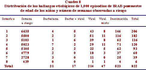 Para estudiar las relaciones entre el grupo de edad en el que se suceden los episodios de IRA y su posible agente etiológico se presenta el Cuadro 8, donde aparecen los hallazgos etiológicos por grupo de edad semestral.