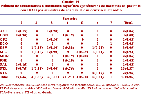 Los cultivos positivos para Sta. aureus fueron los que se aislaron más comúnmente, con una incidencia de 0.37� semanas a riesgo, seguido por los aislamientos de Mycoplasma con una incidencia de 0.23�. La mayor incidencia de bacteriemia por edades, se encontró en el primer semestre de la vida, y decreció con la edad (Cuadro 10).