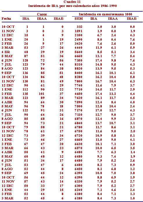 Sin embargo, estudios longitudinales hechos con metodología no igual pero similar, muestran una incidencia de IRA semejante: p.e., en Uruguay9 se informó una incidencia de 5.8 episodios niño/año de observación, con una incidencia más alta en los primeros 12 meses de vida.