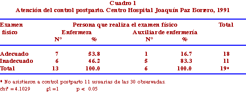 De las 30 usuarias observadas sólo 19 asistieron a control de postparto. De ellas la enfermera atendió a 13 (68%) y la auxiliar de enfermería a 6 (32%). El examen físico se hizo en forma adecuada (observación y palpitación de mamas, observación de involución uterina, inspección de genitales y de secreción vaginal-loquios) a 8(42%) puérperas.