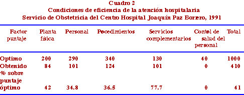 Condiciones de eficiencia. Para determinar las condiciones de eficiencia en el servicio de obstetricia se evaluaron 5 puntos: control de salud para los funcionarios, personal que tiene el servicio, procedimientos, servicios complementarios y planta física. Los resultados fueron: el proceso de hospitalización en el servicio de obstetricia del CHJPB está orientado básicamente a la atención de partos de bajo riesgo.