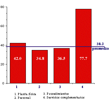 ° El aspecto de servicios complementarios tuvo un promedio de 77.7%; aunque fue más alto, cabe destacar que no se dispone de un mecanismo conveniente que permita el uso de laboratorio especializado (no hay normas que indiquen la remisión de la usuaria para ciertos exámenes de laboratorio); además, el bacteriólogo de la institución sólo tiene horario diurno y no trabaja los fines de semana ni los días festivos.