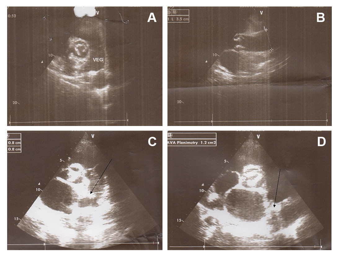 In physical examination, the cardiac examination was not able for prominent grade 3/6 systolic murmurs best heard at the left upper sternal border in second inter costal space with radiation into the anterior left chest. Echocardiogram revealed the presence of a PDA in the setting of normal left ventricular function. However, it had a large diameter but a small shunt was not on TTE echocardiography that caused hemolysis. Transthoracic Echocardiogram showed the left ventricle with conserved systolic function, mild aortic insufficiency with calcified valve, and a fixed structure on the wall of the pulmonary artery with erratic movement indicative of vegetation on orifice of PDA (Figs. 1A and B). Transthoracic Echocardiogram suggested a large (10 mm) PDA with left to right shunt. Pulmonary artery mean pressure was 36 mm Hg, consistent with mild pulmonary hypertension (25-35 mm Hg). Moderate left and right atrial enlargement and a mildly enlarged main pulmonary artery were noted.