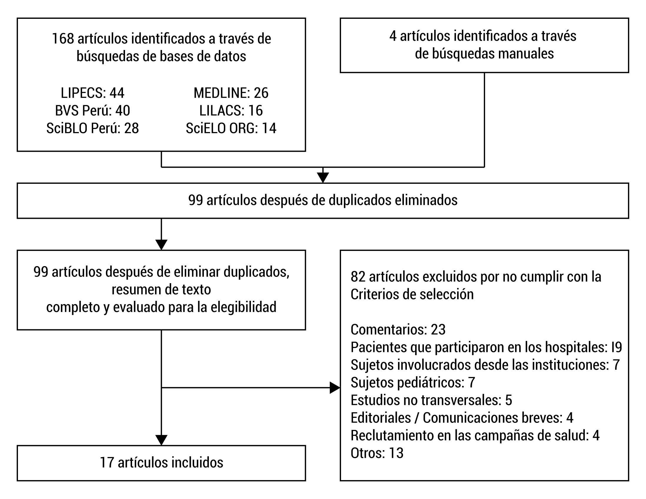 Se encontraron 168 artículos al realizar la búsqueda en las bases de datos y 4 artículos producto de la búsqueda en las referencias de estos artículos. Del total de 172 artículos, 73 fueron excluidos por ser duplicados y los 99 restantes se examinaron a texto completo. De estos últimos, se descartaron 82 por no cumplir los criterios de selección, resultyo en un total de 17 artículos para la fase de extracción de información 19-35 (Fig. 1).