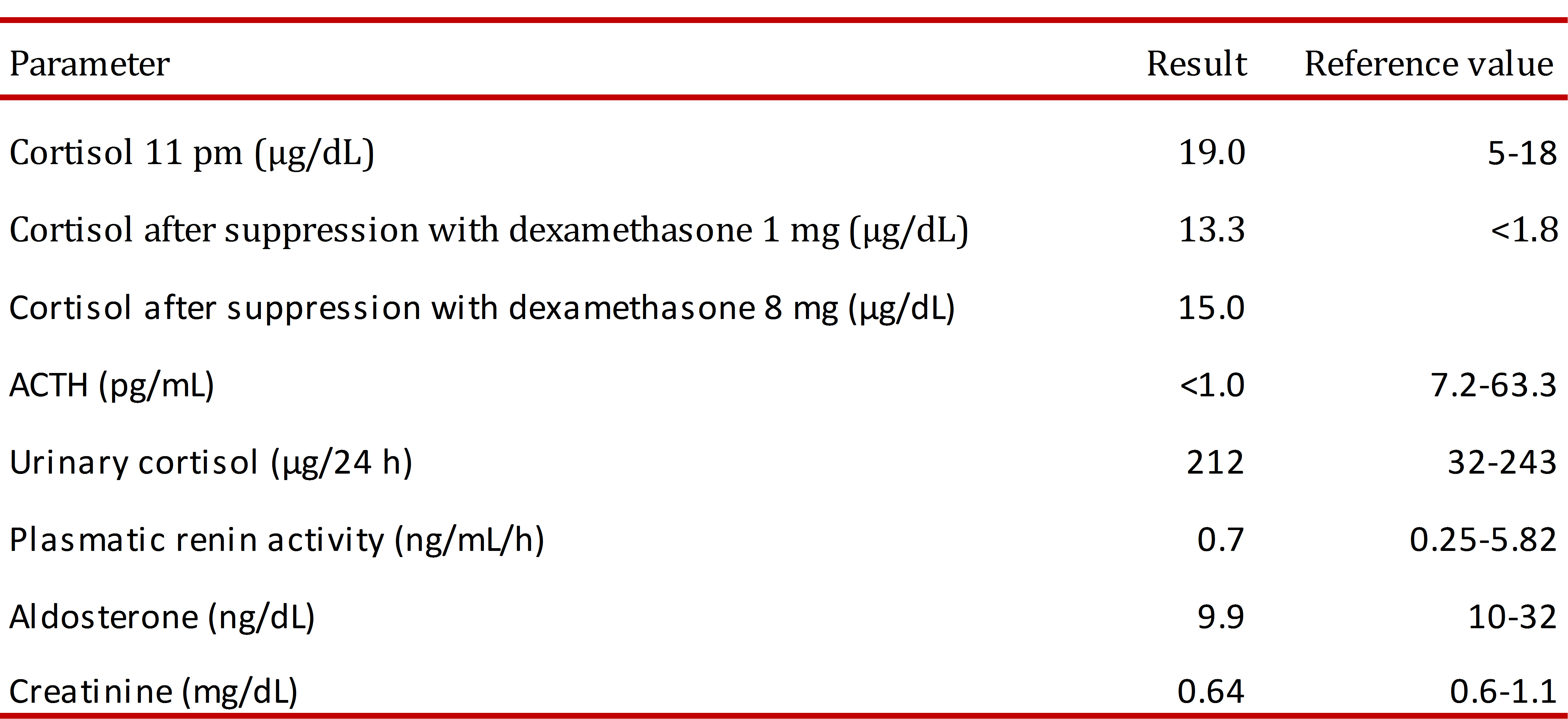 A 76 years-old woman with history of controlled hypertension (with losartan and amlodipine) presented to our hospital referring weight loss of 4 kg in two months, edema that progressed to anasarca and back lumbar pain. Besides the edema her physical examination was completely normal with no clinical signs suggestive of hypercortisolism. Among the studies requested, an abdominal tomography showed a right adrenal gland nodule of 14x9 mm and another one in the left adrenal gland of 23x18 mm (Fig. 1), additionally multiple vertebral fractures were reported. As part of the study of adrenal adenomas the patient had an abnormal value of cortisol after a low dose suppression test with dexamethasone (13.3 µg/dL (normal value: <1.8 µg/dL), with a normal value of free urinary cortisol and her potassium was low (she was not on diuretics). The results of the patient laboratory test are shown on Table 1.