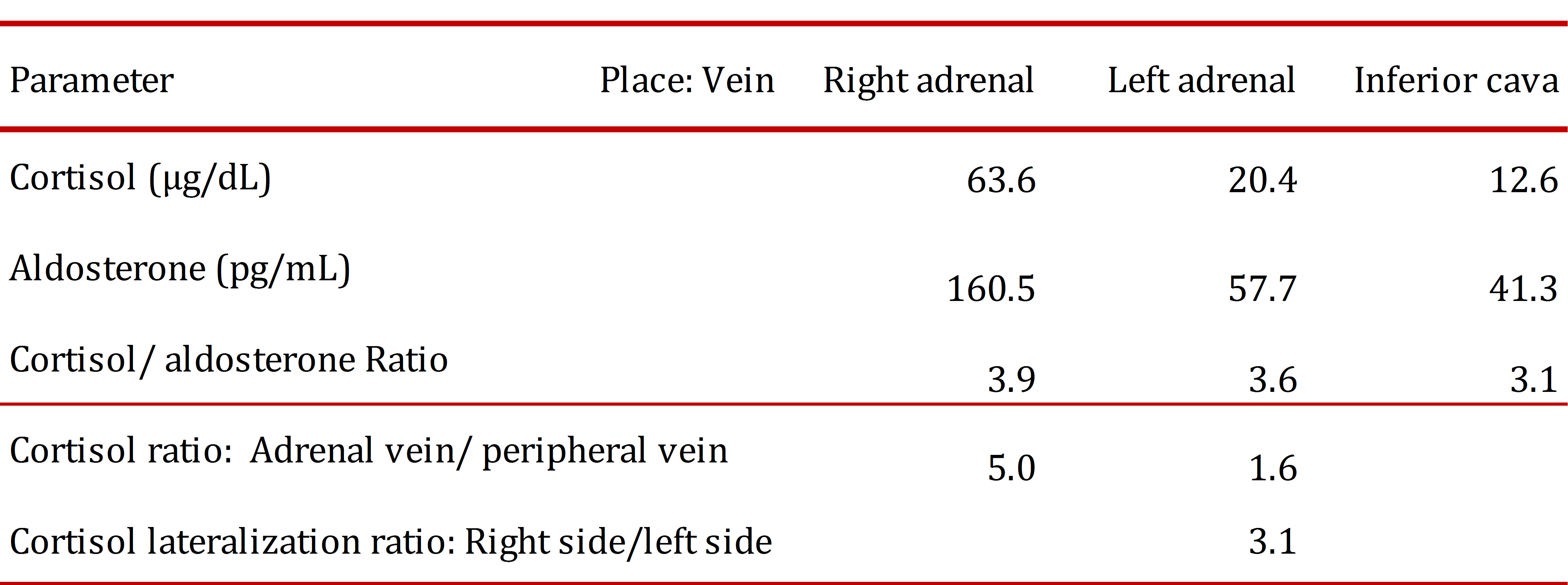 With these results an ACTH (adrenocorticotropic hormone) independent form of hypercortisolism was diagnosed and because the scan of the abdomen had documented the presence of two adenomas, one in each adrenal gland larger than 10 mm, we found ourselves with a therapeutic challenge since the resection of one of the glands may not cure the hypercortisolism in case that the hormonal production came from both glands and the resection of both glands with leave the patient with a permanent hypoadrenalism. It was decided then to perform an adrenal venous sampling to try to determine the origin of the of cortisol production.