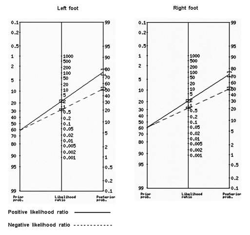 Se utilizó el nomograma de Fagan para estimar la probabilidad de pie plano post-prueba utilizando la razón de verosimilitud y la probabilidad de patología pre-prueba 16.
