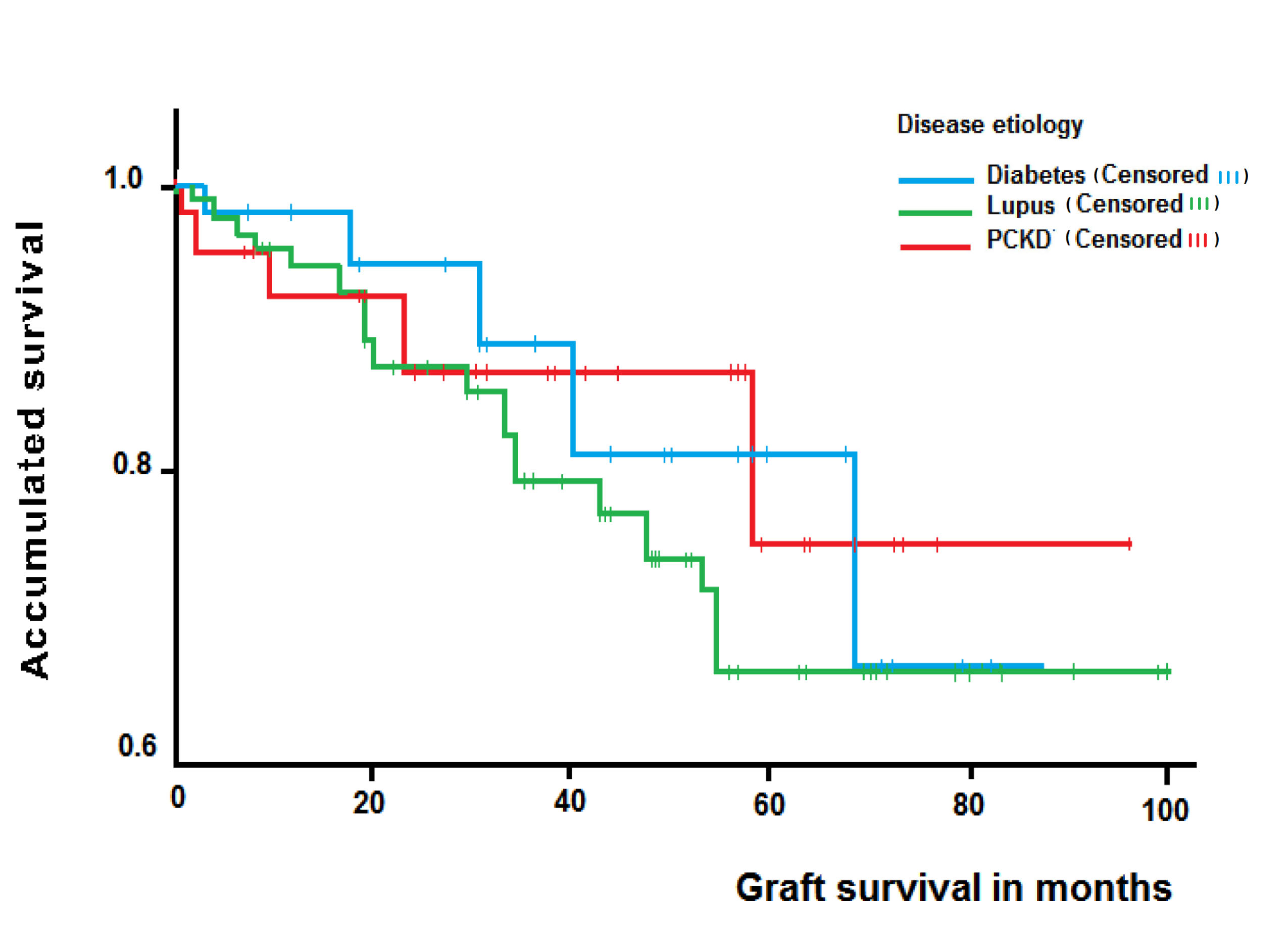 La supervivencia global del injerto censurada por muerte a uno, tres y cinco años fue de 93.3%, 86.9% y 70.8% respectivamente; en el análisis de subgrupos según etiología de la enfermedad, la supervivencia del injerto a uno, tres y cinco años fue de 96.3%, 82.5% y 82.5% en NL, 90%, 86% y 76.5% en ERPQ y 91.7%, 80.3% y 67.9% en ND, sin encontrar diferencias significativas (long rank test= 0.488) (Fig. 2).