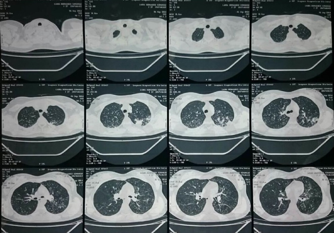 En la tomografía axial computada (TAC) de tórax se observó un engrosamiento y ocupación alveolar con área de cavitación apico posterior del lóbulo superior izquierdo. Se realizó TAC de Tórax de Alta Resolución con hallazgo de nódulos con patrón en árbol de gemación en ambos vértices pulmonares (Fig. 2).