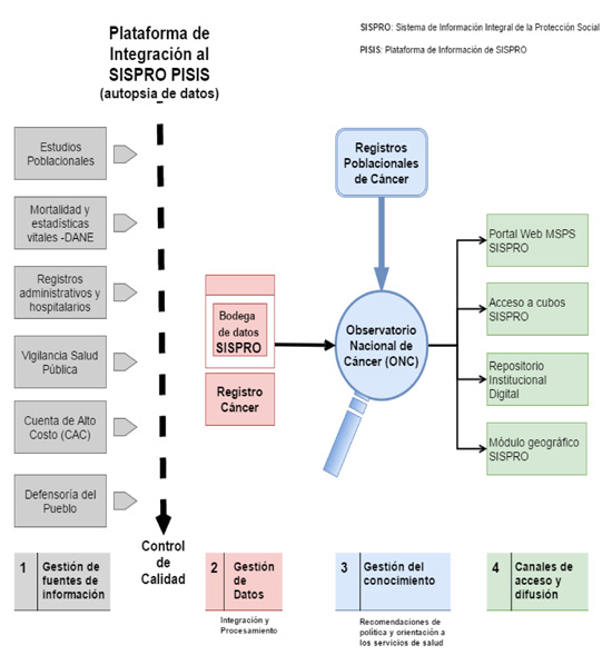 La gestión del conocimiento es el eje del modelo mediante la vigilancia, la investigación y el análisis de la situación de salud respecto al cáncer. El Observatorio Nacional de Cáncer (ONC) es el vocero del SINCan para hacer las recomendaciones de política y orientar al sistema de salud con base en la información proporcionada por el registro de cáncer de la cuenta de alto costo, el Sistema Integral de Información de la Protección Social (SISPRO) y los registros poblacionales de cáncer (Fig. 1).