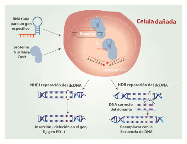 El tercer paso se inicia con la activación de los mecanismos de reparación de la célula, en respuesta al corte que realizó la endonucleasa Cas9, lo que puede ocasionar la pérdida o adición de información genética en la región del genoma que se desea editar. Esto puede conllevar a la pérdida de la función original del gen, dando lugar a una inactivación o un mal funcionamiento de la proteína que codifica. Si el objetivo es reemplazar las mutaciones cancerígenas, a este último paso se le pueden incorporar algunos cambios por una información genética correcta. Este procedimiento consiste en adicionar una molécula de ADN molde homóloga de la región que se quiere editar y que no contenga las mutaciones cancerígenas. Mediante la activación de un sistema de reparación por recombinación homóloga se reemplaza el fragmento del ADN previamente reconocido y tratado por el complejo CRIPR-Cas9 10.