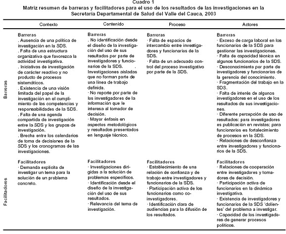 RESULTADOS: Los resultados de la investigación no orientaron las decisiones en salud pública de la Secretaría Departamental de Salud. Las barreras para el uso de resultados de las investigaciones están relacionadas con la inexistencia de políticas y estructura para la gestión del proceso investigativo y con el tipo de relación que se establece entre tomadores de decisión e investigadores. Los facilitadores para el uso de resultados de la investigación se refieren al conocimiento de los funcionarios sobre el proceso investigativo, a cómo se vinculan a éste y a las características de la investigación.