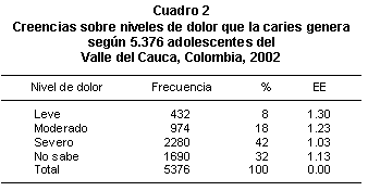OBJETIVO: Conocer las creencias que sobre susceptibilidad y severidad de la caries dental tienen los adolescentes escolarizados del departamento del Valle del Cauca, Colombia.