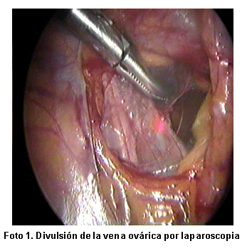 Para el procedimiento quirúrgico se utilizó un laparoscopio operatorio de 10° conectado a un láser de CO2 y a un sistema de video. Se realizaron 3 puertos de entrada, un puerto principal de 11 mm umbilical y 2 puertos laterales de 10 mm. Después de confirmar por laparoscopia el diagnóstico de várices pélvicas con la paciente en posición neutra y a baja presión intraabdominal, se acomoda en posición de Trendelenburg. Se incide el peritoneo con láser de CO2 en superpulso, a nivel de la pared lateral derecha de la pelvis de la mujer sobre el músculo psoas, a la altura de la espina ilíaca anterior superior, con una adecuada identificación del trayecto del uréter y de la arteria ilíaca común. Luego, se levanta el ligamento infundíbulo pélvico para individualizar el paquete vascular gonadal. Con una pinza atraumática se divulsiona el componente venoso, dejando separada la arteria ovárica contra la pared pélvica (Foto 1). Se introduce por el puerto lateral el instrumento de Ligasure® (Valleylab, TYCO Health Care) y se realiza la ligadura de las venas gonadales, con energía bipolar controlada por la impedancia sobre el tejido (Foto 2). Confirmada la hemostasia, se repite el procedimiento en el lado izquierdo por el otro puerto lateral, previa movilización del colón sigmoide.