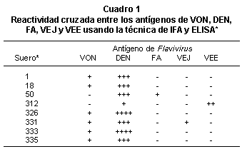 La prueba de ELISA usada en este estudio, con antígeno recombinante para establecer la presencia de anticuerpos contra el VON, aumenta posiblemente la sensibilidad, pero disminuye la especificidad en este estudio por la presencia de las reacciones cruzadas con el virus del dengue. Estos resultados contrastan con los de IFA, en los que se utilizan células infectadas con los arbovirus (VON, VEE, VEJ, FA y DEN) en la cual se observaron menos reacciones cruzadas aunque tampoco se tenían sueros conocidos de casos de infección por VON, para establecer su valor diagnóstico.
