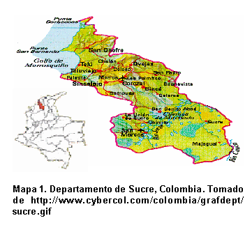 Lugar de obtención de los sueros. Los sueros se obtuvieron en el departamento de Sucre en los municipios de Tolú, Sampues, Sincelejo, San Marcos, Morroa, San Onofre, Coveñas, San Benito Abad, San Antonio de Palmitos, Corozal, Guaranda y San Pedro. Este departamento se encuentra localizado al noroeste de Colombia entre el río Cauca y el mar Caribe. Tiene una superficie de 10.917 km2, con una temperatura promedio anual de 30°C; un poco más de la tercera parte de su territorio es depresión inundable del bajo Magdalena-Cauca-San Jorge, caracterizada por numerosas ciénagas donde anidan aves autóctonas y migratorias provenientes del hemisferio norte, sobre todo a lo largo del río San Jorge al sudeste del departamento (Mapa 1).
