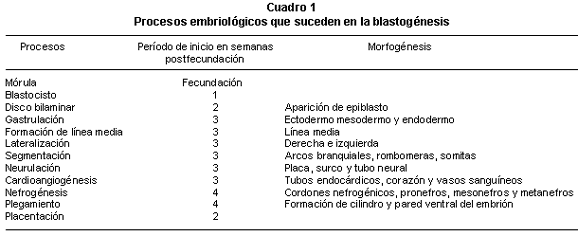 Específicamente en el complejo OEIS y en el complejo cuerpo extremidad se ha sugerido que puede tener este defecto su origen en el período de la blastogénesis13-15 que comprende entre la fecundación y el día 28; durante este tiempo el óvulo fecundado se desarrolla como mórula, blastocisto, se realiza la gastrulación, desaparece la cavidad coriónica y además, en la cuarta semana se lleva a cabo el plegamiento convirtiendo el embrión en un cilindro (Cuadro 1) eventos determinantes para el normal desarrollo del período embrionario, que se inicia el día 29 y finaliza en la semana 8 postfecundación (semana 10 de amenorrea), dando paso al período fetal que se continúa hasta finalizar el embarazo13.