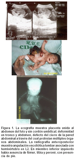 Autopsia fetal. Feto de sexo femenino con 1.250 g de peso. No se evidenció cordón umbilical. El intestino grueso, delgado, apéndice, hígado y bazo se encontraron por fuera de la cavidad abdominal. En los bordes del defecto de la pared abdominal se observaron adherencias placentarias. En la extremidad inferior derecha se encontró formación en garra del pie, acortamiento y sindactilia. En el miembro inferior izquierdo se observó anillo de constricción entre la pelvis y el pie. Además, ausencia de fémur, tibia y peroné. En la placenta se observaron inclusiones de pigmento en los macrófagos de Hoffbawer que indican corioamnionitis temprana, pudiendo ser ésta la causa de la ruptura amniótica y/o adherencias placentarias a los órganos abdominales y extremidades en el período embrionario, lo cual condujo al no cierre de la pared abdo-minal y al no desarrollo del cordón umbilical, además de los defectos en miembros inferiores. Diagnóstico final de complejo cuerpo extremidad.