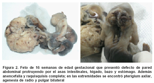A las 16 semanas y 5 días se obtuvo un producto de sexo femenino que pesó 350 g, cordón umbilical con una arteria y una vena. Presentó además anencefalia y raquisquisis completa, agenesia de ojo izquierdo con fisura palpebral cerrada y muy pequeña y agenesia pulmonar izquierda; en corazón se observaron dos tubos endocárdicos separados, el derecho con aurícula y ventrículo, el izquierdo sólo con ventrículo, defecto de pared abdominal con asas intestinales, hígado, bazo y estómago cubiertos por amnios y unidos a la placenta directamente. El diafragma presentó dos hernias: por la izquierda protruyen a cavidad torácica el riñón, la glándula suprarrenal y el lado izquierdo del hígado. Por la hernia derecha protruye el riñón y la glándula suprarrenal derecha. En las extremidades se encontró pterigium axilar, agenesia de radio y pulgar bilateral, deformidad en flexión de caderas y pie equino varo bilateral. Se concluyó como diagnóstico complejo cuerpo extremidad (Figura 2).