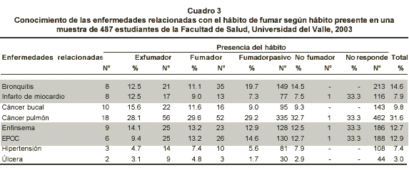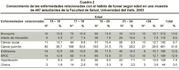 Opiniones sobre enfermedades relacionadas con el hábito de fumar. Del total de participantes, 462 (94.9%) relacionan el cáncer pulmonar con el hábito de fumar; 213 (43.7%) con la bronquitis crónica, 188 (38.6%) con la enfermedad pulmonar obstructiva crónica, 186 (38.2%) con enfisema, 143 (29.4%) con cáncer bucal, 116 (23.8%) con infarto de miocardio, 108 (22.2%) con hipertensión y 44 (9%) con úlcera. En el Cuadro 2 se discrimina el resultado por edad y en el Cuadro 3 se distribuye según los hábitos de fumar presentados.