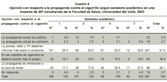 Opiniones sobre publicidad en contra el tabaquismo. Acerca de la publicidad en contra del consumo de tabaco, 18 (3.7%) opinaron que la propaganda actual es suficiente y 22 (4.5%) que se justifica; 251 (51.5%) manifestaron que la prensa, la radio y la televisión deberían informar más sobre los problemas que tiene el hábito de fumar, seguida de 98 (20.1%) que consideran que la propaganda es irrelevante a la hora de fumar; además, 80 (16.4%) creen que en las cajetillas de cigarrillos se debería ilustrar más el peligro. En el Cuadro 4 se distribuyen las opiniones acerca de publicidad por semestre académico, y se muestra cómo a mayor nivel de estudios hay una mayor cantidad de estudiantes que consideran la propaganda irrelevante a la hora de fumar.