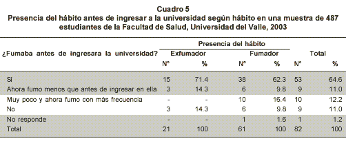 Antecedentes de consumo antes y después de ingresar a la universidad. 53 (64.6%) de los fumadores y ex-fumadores afirmaron haber adquirido el hábito antes de ingresar a la universidad, y 19 (23.2%) lo adquirieron o lo aumentaron dentro del ambiente universitario (Cuadro 5).