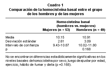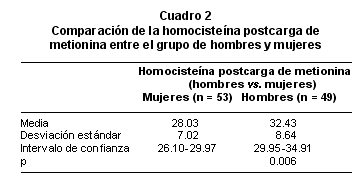Para el cálculo del valor normal de homocisteína basal se tomó como criterio la media + 2 DE de los 102 individuos, obteniéndose un valor <16.32 mM. Se encontró una persona con una concentración de homocisteína en ayunas de 21 mM, que corresponde a hiperhomocisteinémica moderada, de acuerdo con la clasificación de Refsum et al.6, entre la homocisteína basal de los hombres (n = 49) y mujeres (n = 53) (Cuadro 1). No se encontraron diferencias estadísticamente significativas en los niveles basales de homocisteína por sexo, luego de ajustar por edad, ejercicio, hábito de fumar y dieta (p= 0.168). Luego de administrar 100 mg/kg de metionina, se encontró una diferencia significativa (p =0.006) en el aumento de homocisteína total entre hombres (32.43 + 8.64) y mujeres (28.03 + 7.02) (Cuadro 2).