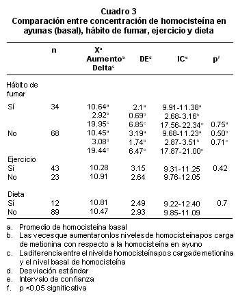 Al comparar los valores de homocisteína basal, el delta es decir la diferencia entre el nivel de homocisteína post-carga de metionina y el nivel basal, las veces que el valor de homocisteína aumentó, con el hábito de fumar, el ejercicio y la dieta, no se encontraron diferencias significativas con el grupo de personas que no fuman, no hacen ejercicio ni dieta (Cuadro 3), esto puede significar que ninguna de estas variables afecta el resultado obtenido de la cuantificación de homocisteína.