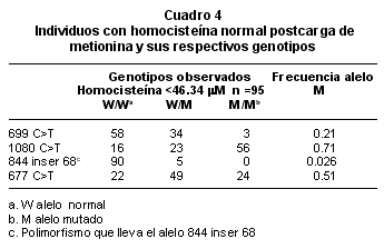 Objetivos: Se definieron los niveles de homocisteína basales y post-carga de metionina en una población de 102 personas asintomáticas, y se calcularon las frecuencias de las variantes alélicas c.699 C >T (exón 6) c.1080 C>T (exón 10) de la CBS, y de c.677 C>T (exón 1) de la MTHFR. Se estudió la asociación entre estas variantes alélicas y la hiperhomocisteinemia.