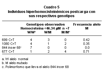 Se consideraron hiperhomocisteinémicos post-carga, a las personas con valores de homocisteína X + 2 DE (>46.34 mM); con este criterio se identificaron 7 personas con valores superiores a este punto de corte. En este estudio en total se encontraron 8 individuos con hiperhomocisteinemia moderada; 7 post-carga de metionina y un individuo con hiperhomocisteinemia basal (siete hombres y una mujer).