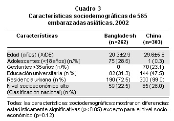 Las características sociodemográficas en las embarazadas incluidas en el estudio fueron diferentes, lo cual era de esperarse, si se tienen en cuenta las diferencias en los contextos sociales, étnicos, nutricionales, culturales y religiosos de los dos países. En la República Popular China (RPC) por políticas estatales de control de la población usualmente la mujer tiene un solo hijo el cual lo planea la pareja una vez que la mujer haya finalizado sus estudios universitarios. Esto explica en parte, la alta proporción de embarazadas con nivel universitario y una edad promedio de 30 años (Cuadro 2). En Bangladesh por aspectos religiosos, como la religión musulmana no recomienda la planificación familiar, se explica la alta proporción de adolescentes en embarazo (Cuadro 2). La RPC es el país más poblado del mundo, y, a pesar de ser una potencia económica, por ser tan grande su extensión geográfica, se considera un país en vías de desarrollo. Shanghai por su parte, es la ciudad más importante de la economía china, y por tanto desarrollada, con una baja morbilidad y mortalidad materna en la población. Por el contrario, en Dhaka (la capital de Bangladesh, el segundo país más pobre del mundo, con serios problemas de densidad demográfica, desnutrición y analfabetismo en su población general), hay problemas graves de morbilidad y mortalidad materna.