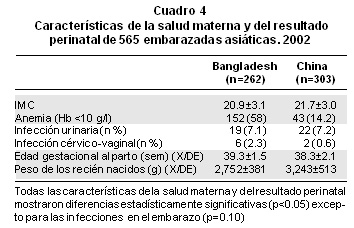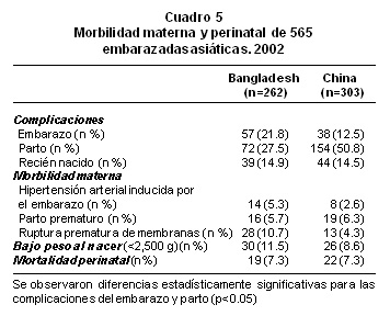 En las madres se observaron 135 (23.9%) complicaciones (ruptura prematura de membranas, 10.3%; parto prematuro, 8.4%; hipertensión arterial inducida por el embarazo, 3.9%; hipertensión gestacional, 2.2%; preeclampsia, 1.7%; y diabetes gestacional, 0.9%). Entre los recién nacidos hubo 57 (10.1%) de bajo peso, con una tasa de mortalidad perinatal de 73 por mil nacidos vivos. La edad gestacional promedio al parto fue 38.7±2 semanas y el peso promedio de los recién nacidos fue 3,025±520 g. Las complicaciones del embarazo fueron más frecuentes en Bangladesh; sin embargo, las del parto lo fueron más en China y se explican por una alta tasa de cesáreas por desproporción cefalopélvica; en contraste, la mortalidad perinatal fue igual en ambos países (Cuadro 5).
