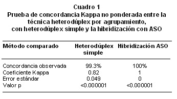 Comparación de los métodos. En las 400 muestras analizadas se compararon los resultados obtenidos mediante la técnica PCR-heterodúplex por agrupamiento y otros métodos ya validados como PCR-heterodúplex simple e hibridización con sondas alelo específicas (ASO) para la identificación de la mutación F508del. Se procedió al análisis estadístico mediante una prueba de concordancia Kappa no ponderada, con valores de concordancia entre 99.2% y 100%, respectivamente, con un valor p<0.00001 en ambas comparaciones (Cuadro 2).