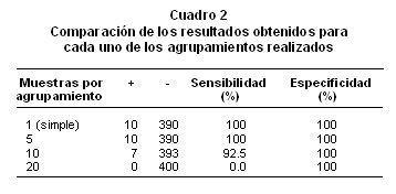 Determinación de la especificidad de la técnica. La especificidad se evaluó mediante la identificación de resultados falsos positivos, en diez agrupamientos compuestos por muestras de los controles sanos, negativos para la mutación F508del. Los resultados obtenidos se compararon con la especificidad determinada para la PCR heterodúplex sin agrupamientos.