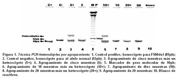 Conclusiones: Se demostró la sensibilidad y reproducibilidad de la técnica PCR Directa-heterodúplex por agrupamientos de hasta 10 muestras, que se pueden emplear en programas para filtrar heterocigotos y afectados de F508del.