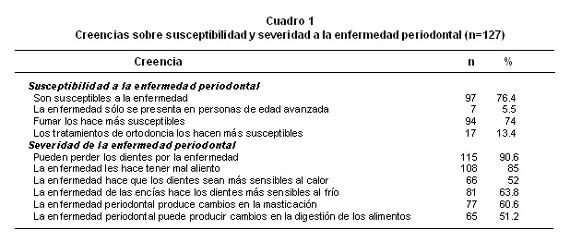 Conclusiones: El modelo de creencias en salud permitió conocer las creencias sobre enfermedad periodontal. Aunque una gran proporción de los participantes sufre de enfermedad periodontal, un poco más de la mitad ignora que la padece; los participantes no cuentan con suficiente información sobre la enfermedad. Aunque los participantes se sienten susceptibles y conocen los beneficios de estar libre de la enfermedad periodontal, casi la totalidad de los encuestados están afectados.