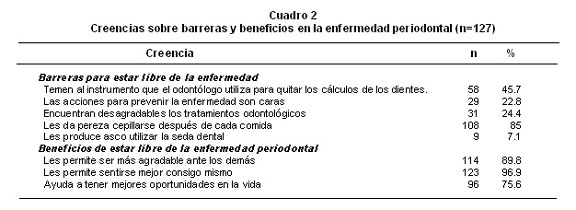 Resultados: De 127 participantes, 69.3% creen que el sangrado gingival es signo de enfermedad, y 65.4% creen que la enfermedad periodontal es consecuencia de la mala higiene oral; 86.6% afirmaron que no tener la enfermedad les ayuda a desempeñarse socialmente. Además, 23% creen que prevenir la enfermedad periodontal es costoso. Sólo 2.3% presentaron valores menores a 12% (considerado como normal) en el índice de IPB. En 97.6% hubo algún parámetro de enfermedad periodontal como sangrado, cálculo y bolsas.