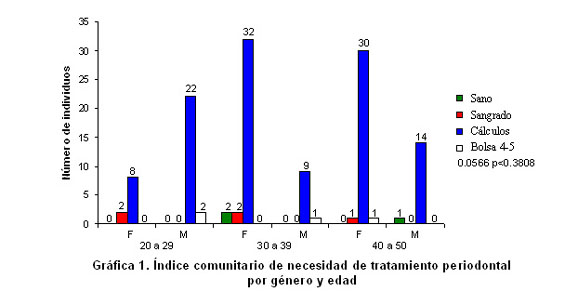 De acuerdo con los criterios y registro de los hallazgos del estado periodontal de los participantes, 3 de ellos (2.4%) tenían código 0 (TN0 no requieren tratamiento); 5 (3.9%) código 1 (TN1 instrucciones de higiene oral únicamente); 118 (92.9%) código 2 (TN2 detartraje y profilaxis más instrucciones de higiene oral); y 1 (0.8%) presentó código 3 (TN3 tratamiento complejo más instrucciones de higiene oral).
