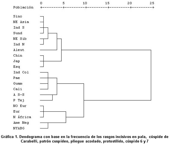 Se observaron altas frecuencias de la cúspide de Carabelli de mediano tamaño (grado 5), patrón cuspídeo +5 y +6, cúspide 7, protostílido (punto P o foramen secum) y pliegue acodado. Los rasgos morfológicos winging, incisivos centrales y laterales en pala, doble pala, número de cúspides y cúspide 6 presentaron frecuencias bajas. Se demostró la simetría bilateral y ausencia de dimorfismo sexual (a excepción de winging, incisivos en pala y protostílido) (Cuadro 2). Mediante las frecuencias de los rasgos incisivos en pala, cúspide de Carabelli, patrón cuspídeo, pliegue acodado, protostílido, cúspide 6 y 7, se hizo una matriz de distancias y se obtuvo un dendrograma que calculó las relaciones biológicas macro-evolutivas de la muestra en estudio con base en modelos geográficos, socio-culturales y biológicos de la distribución y comportamiento de dichos rasgos en grupos poblacionales diferentes (Cuadro 3, Gráfica 1).