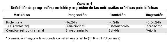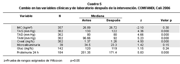 Resultados: En total se evaluaron 8 parámetros, 4 clínicos y 4 de laboratorio, así como la proporción de pacientes según estadío de nefropatía (KADOQUI) entre un tiempo y el otro. En las variables clínicas como tensión arterial sistólica, diastólica, media y proteinuria en 24 h, las diferencias encontradas entre antes y después de la intervención tuvieron significancia estadística. Pero, tanto en el índice de masa corporal (IMC) como en la glucemia y la microalbuminuria no hubo diferencias estadísticamente significantes entre las dos mediciones.