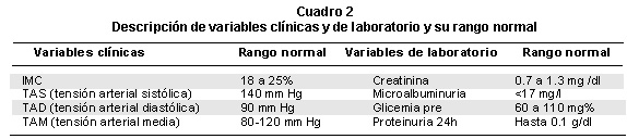 En el presente caso se tomó la TFG (valor normal 60 a 120 ml/min/1.73), como la variable resultado.