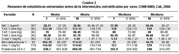 De acuerdo con el perfil epidemiológico (Muñoz A. oct. 2006, datos sin publicar) de COMFANDI del total de los 230,000 afiliados, 10% tienen diagnóstico de HTA crónica y 2% de DM, con un grupo intersección entre 6% y 7% de pacientes con distintos grados de deterioro en su función renal (nefropatía).